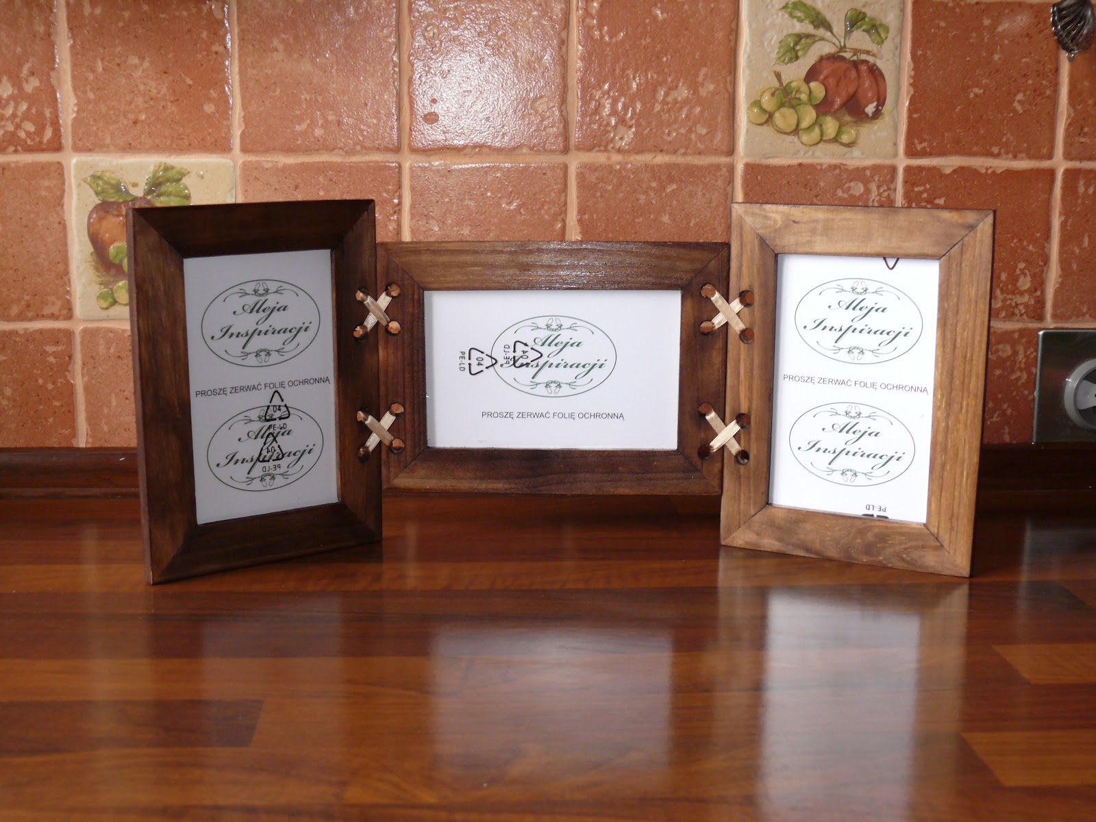 3. 3 ramki wiązanych fstążką na zdjęcia o formacie 10cm x 15cm - 3 pionowe zdjęcia. Całość zabejcowana kolorem mahoń i polakierowana